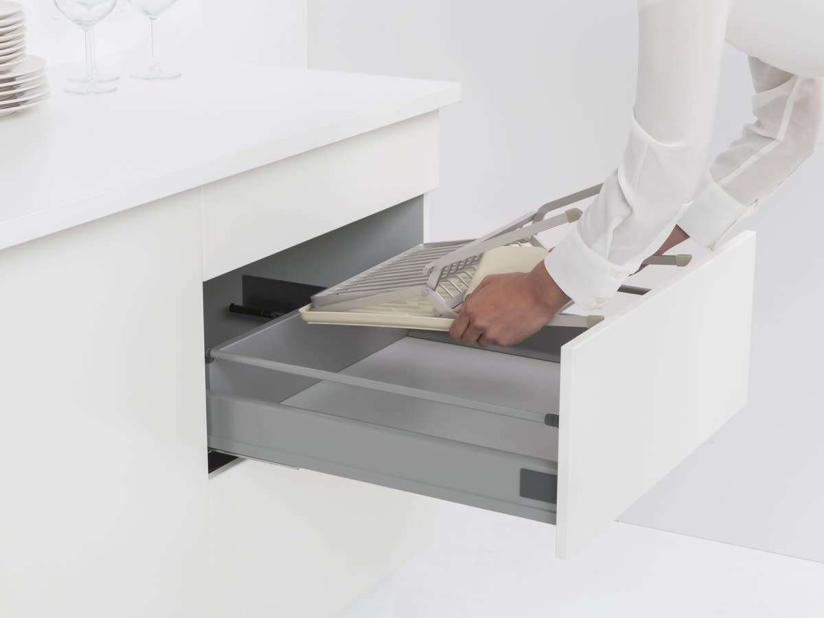 Klappbares Abtropfgestell mit Abtropfschale für bis zu 13 Teller. Platzsparend, mit Besteckbehälter und rutschfesten Füßen. Hält die Arbeitsplatte trocken. Jetzt bestellen und Ordnung schaffen.