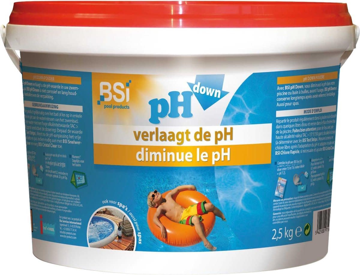BSI pH Down Pulver senkt einfach den pH-Wert in Ihrem Pool oder Spa. Ideal bei einem pH-Wert über 7,6. Nicht korrosiv und einfach anzuwenden. Lange haltbar nach dem Wiederverschließen. Perfekt für klares und gesundes Wasser!