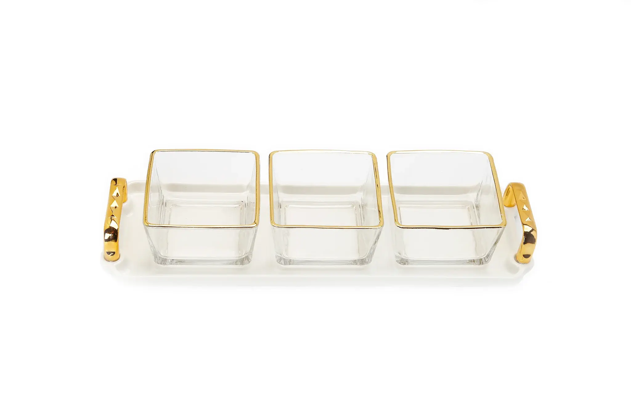 Dieses Relish-Gericht verfügt über 3 Glasschalen mit Goldbesatz. Es wurde von professionellen Kunsthandwerkern gefertigt und eignet sich perfekt für alle Gelegenheiten. Die Schalen passen perfekt auf das weiße Tablett und sorgen so für ein einfaches Servi