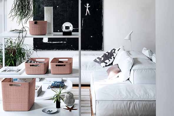 Kleine rechteckige Aufbewahrungskörbe in Beige, Braun, Grau und Rosa, ideal zur Organisation kleiner Gegenstände. Aus recyceltem Material hergestellt – eine umweltfreundliche Wahl für jedes Zuhause.