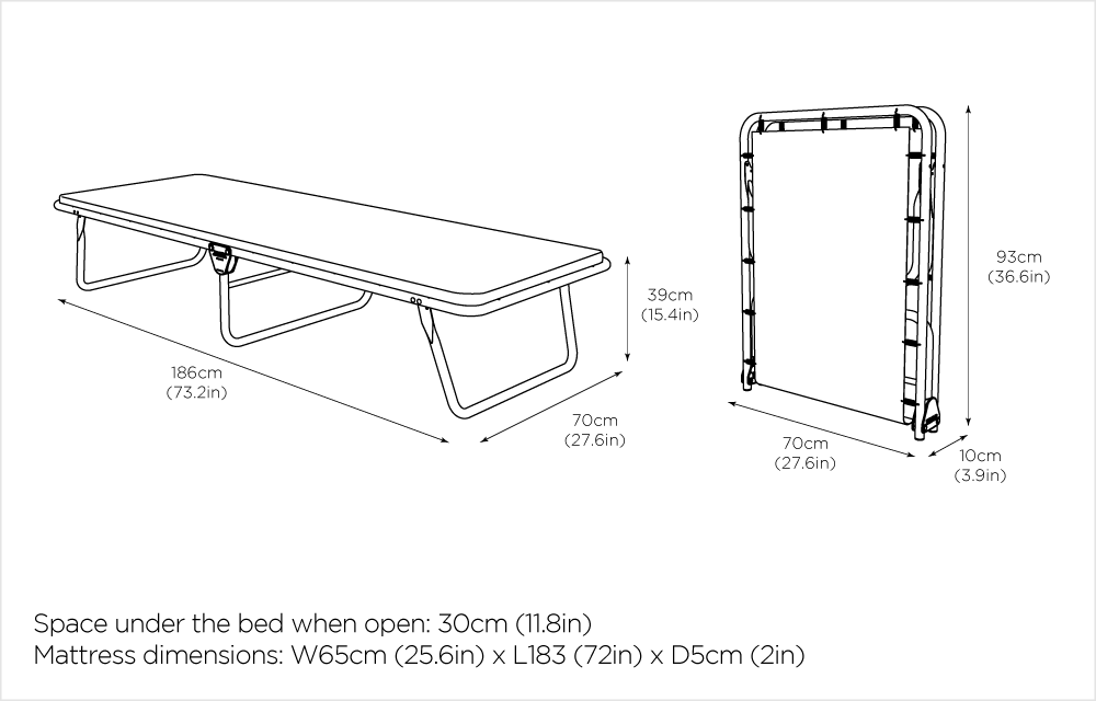 Dieses leichte und kompakte Bett ist ideal für Camping oder Reisen und verfügt über eine atmungsaktive Rebound-E-Fibre-Matratze und eine langlebige J-Tex-Federbasis für Komfort und Halt. Es ist umweltfreundlich, hypoallergen und verfügt über eine lebensla