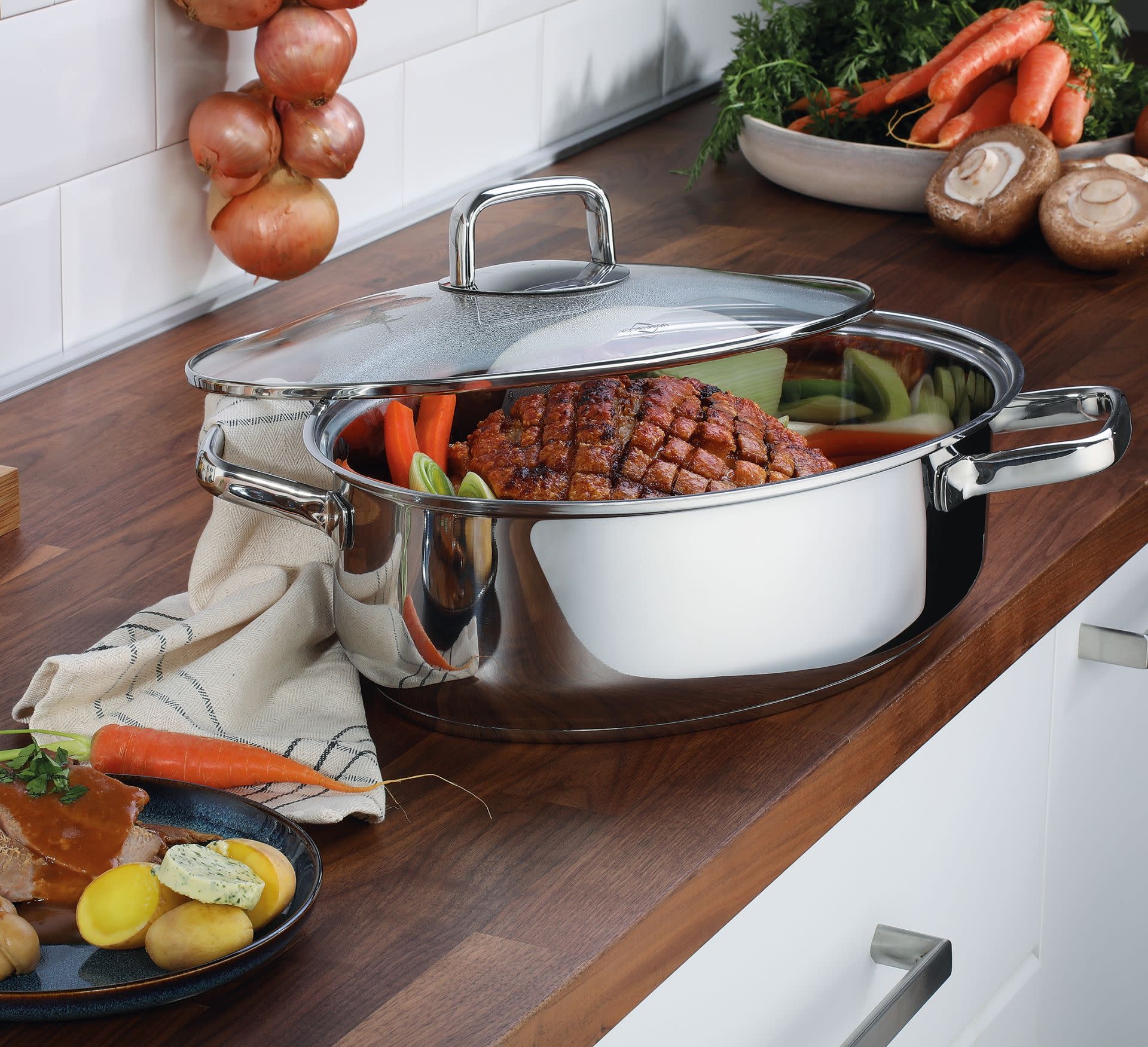 Die extra starke Edelstahl-Multischicht-Bodenplatte sorgt für gleichmäßige Wärme, saftige Braten, perfekt gegartes Gemüse und knusprige Gratins. Geeignet für alle Herdarten inklusive Induktion, ofenfest bis 250 °C.