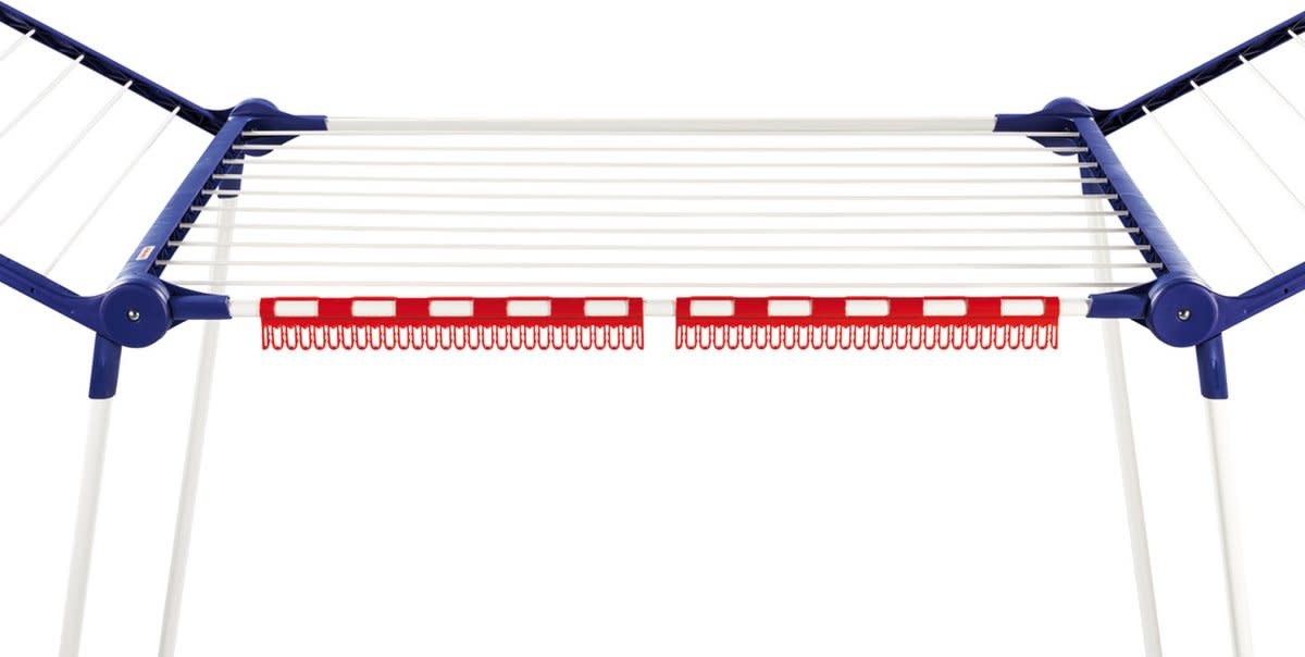 Dieser Wäscheständer verfügt außerdem über zwei Halterungen für kleine Gegenstände, die dafür sorgen, dass diese beim Trocknen an ihrem Platz bleiben. Das Aufstellen und Zusammenklappen des Pegasus 200 Solid ist mühelos. Die Trockenstäbe sind für eine längere Haltbarkeit mit einer speziellen rostbeständigen Oberfläche beschichtet.