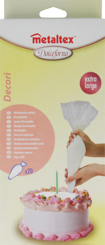 Metaltex Dolcforno Spritzbeutel Einweg Machen Sie die schönsten Dekorationen mit diesen Spritzbeuteln von Metaltex. Die Beutel ermöglichen ein besonders langes Dekorieren, da sie besonders groß sind. Das Set enthält zwanzig Einweg-Spritzbeutel.