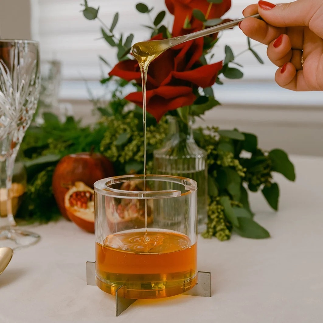 Dieses wunderschöne MetaLucite-Honiggericht wird Ihren Rosch Haschana versüßen. Steht auf Metall für ein ultraschönes Stück! Diese luxuriöse Schale aus Plexiglas verfügt über einen magnetischen Deckel, einen Metalllöffel für den Honig und ein Loch im Deckel, in das der Löffel passt. Superleicht zu reinigen. Die perfekte Art, Ihren Honig zu präsentieren!