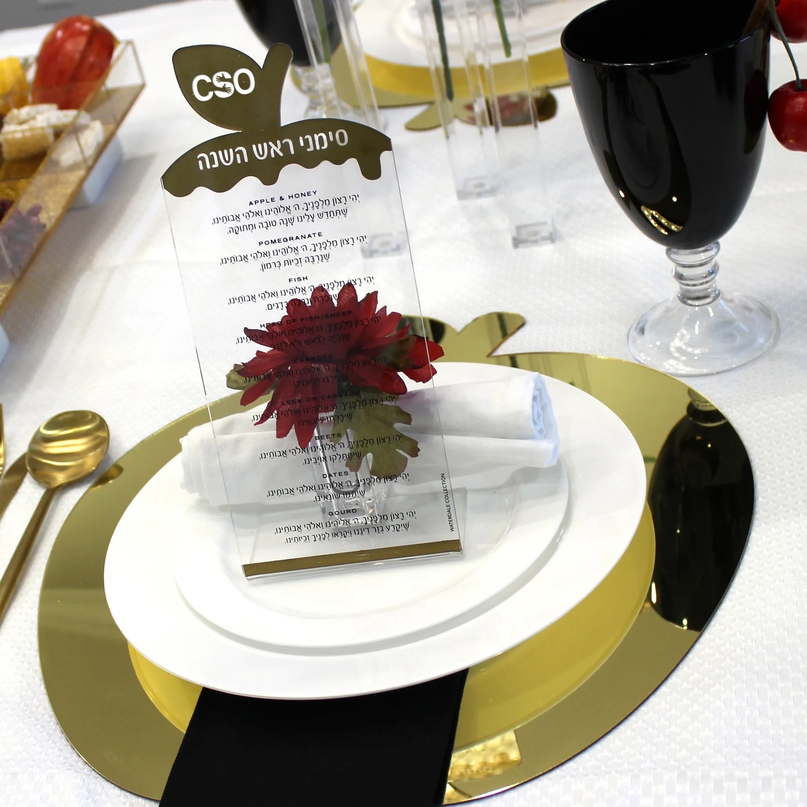 Diese atemberaubende, mattierte Apple-Simanim-Tischplatte aus Lucite ist freistehend, so elegant und die perfekte und praktische Ergänzung für Ihren Rosh Hashanah-Tisch! Stellen Sie es neben jeden Sitz oder verwenden Sie es als wunderschönes Mittelstück. Bringen Sie den Apfel mit einer eleganten Note zur Geltung. Abwischbar, honigfest und wasserfest.