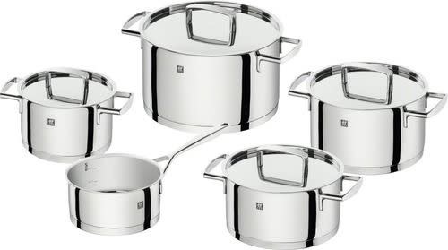Dieses 5-teilige Kochtopfset vereint modernes Design mit Praktikabilität für alle Herdarten, auch Induktion. Es verfügt über dicht schließende Deckel, Innenmaße und hygienischen Edelstahl.