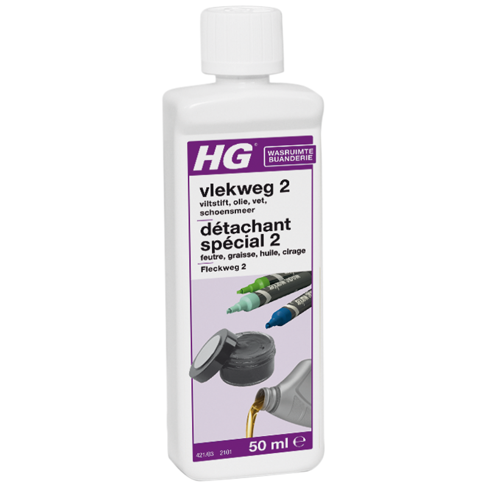 HG tache n° 1. 2, le meilleur détachant de graisse pour vêtements qui élimine les taches causées par les marqueurs, la graisse, l'huile, le cirage, mais aussi l'huile de cuisson, la graisse de friture, les lubrifiants, les autocollants ou les Tippex. Le détachant gras pour vêtements HG détachant no. 2 est l’un de nos 7 produits spéciaux anti-taches HG.