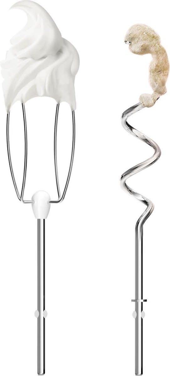 Livré avec deux fouets et deux crochets pétrisseurs en acier inoxydable. Le bouton d’éjection facilite le changement d’accessoires. Compatibles lave-vaisselle.