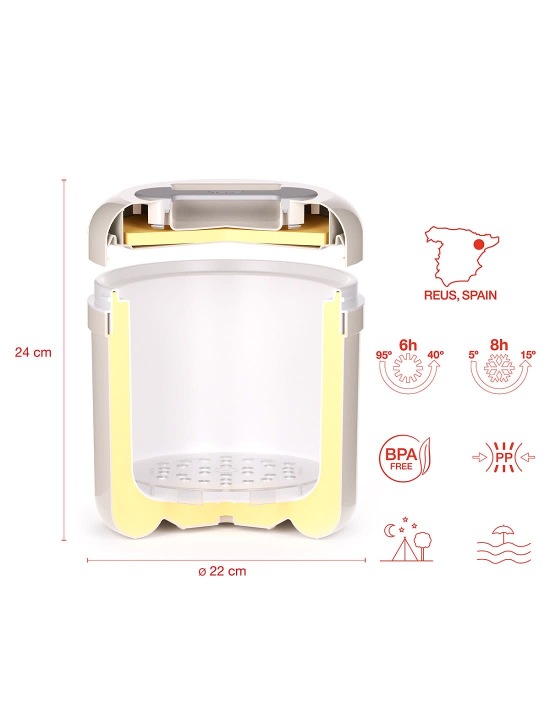 Seau à glace fabriqué en Espagne avec polypropylène sans BPA et structure en mousse isolante résistante aux chocs. Capable de garder les glaçons au frais jusqu'à 6 heures. Comprend un bac collecteur. Parfait pour une utilisation dans une grande variété de situations : pique-nique, plage, travail, etc.