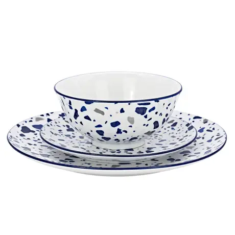 Deze Pica porseleinen 12-delige serviesset is een stijlvol en duurzaam servies voor vier personen. De set heeft een prachtig blauw terrazzo dessin met een opvallende blauwe rand, een combinatie van modern en klassiek.