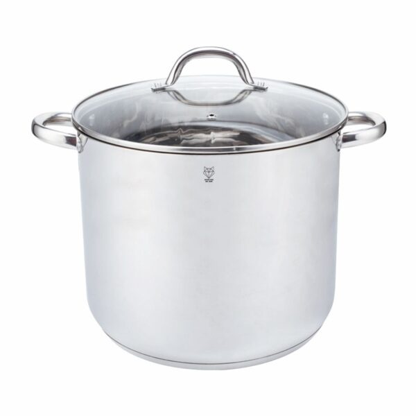 Grote RVS soeppot van 9,7 liter voor soep, pasta en stoofgerechten. Met energiezuinige kapselbodem, glazen deksel met stoomopening en geschikt voor alle warmtebronnen. Ideaal voor grote porties en mealprep.