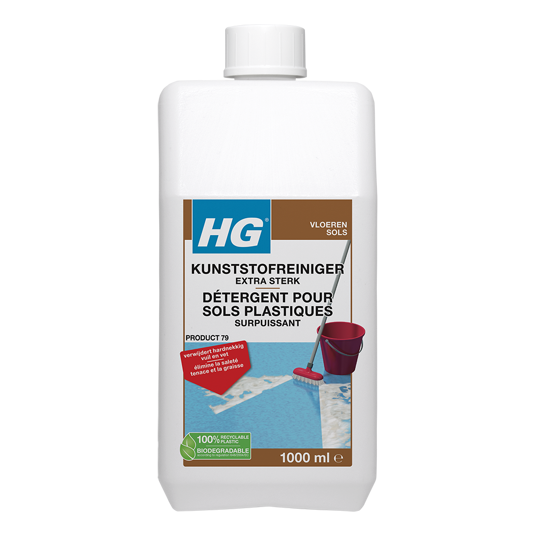 - Los 1 liter HG kunststofreiniger extra sterk op in een halve emmer (5L) lauw water en breng dit aan op de vloer met behulp van een dweil of mop.