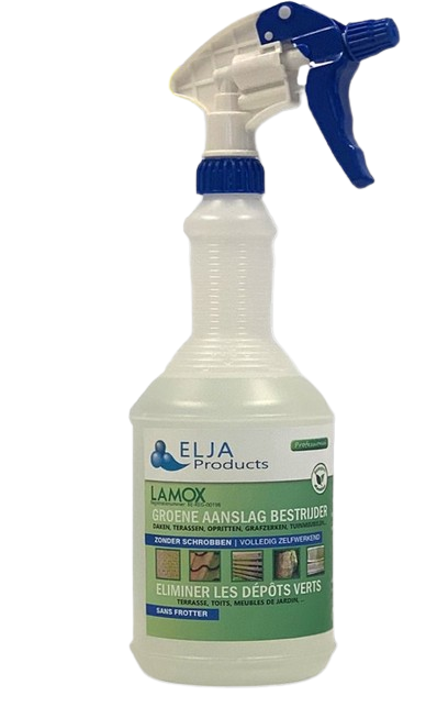 ELJA Groene Aanslag Verwijderaar is een gebruiksklare en milieuvriendelijke formule die effectief groene aanslag verwijdert van verschillende oppervlakken zonder schrobben, en het beschermt tegen hergroei gedurende vele maanden.