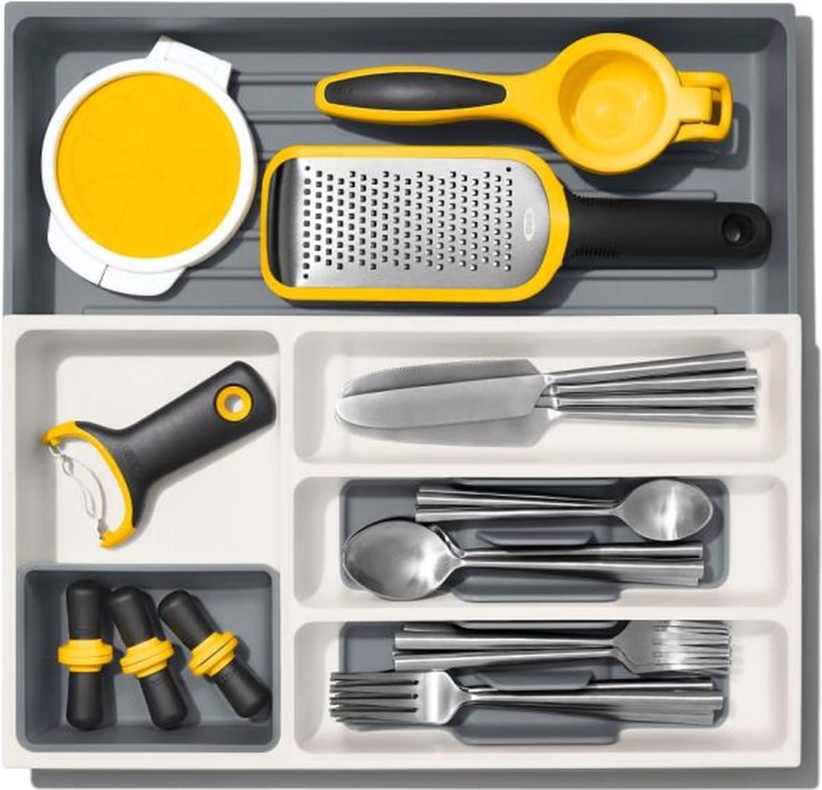 Deze slimme en uitbreidbare lade-organizer van OXO brengt orde en overzicht in elke keukenlade.