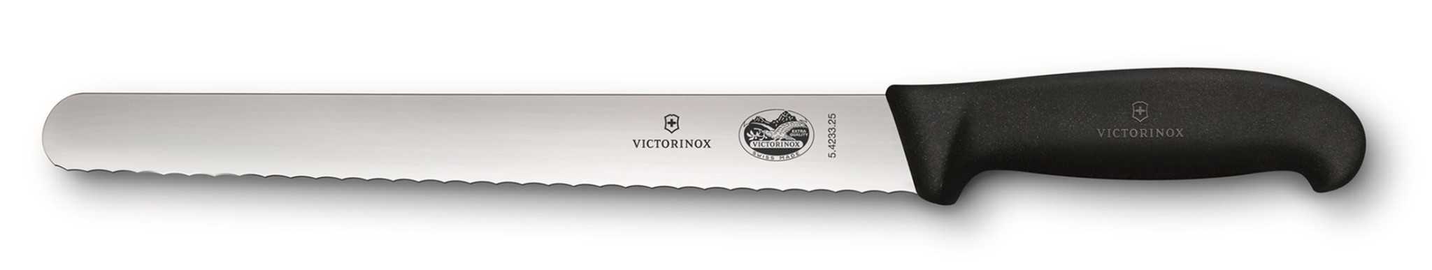 Dit Victorinox Fibrox® Pro Snijmes heeft een gekarteld lemmet van 25 cm en is geweldig voor het snijden van vlees, gebak, sandwiches en meer. Het is vooral goed voor rosbief. Dit mes is vaatwasmachinebestendig en kan worden gesteriliseerd.