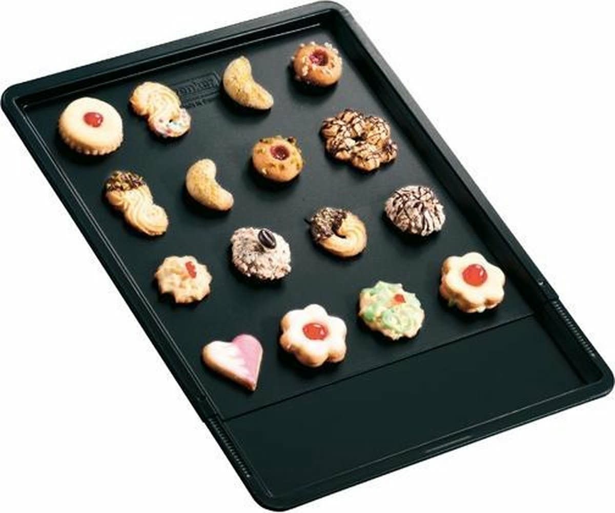 Zenker's bakplaat past in alle ovens, uitschuifbaar voor veelzijdigheid. Niet vaatwasmachinebestendig. Snij er niet op, maak hem vet voor gebruik in. Koel 10 min na oven. Hittebestendig tot 230°C. Roestvrij staal met anti-aanbaklaag, PFOA-vrij.