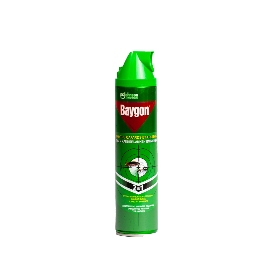 Baygon Green Insecticide Spray Can. The product is solely authorized for the control of crawling insects (cockroaches, ants, silverfish, bed bugs…) in living and habitation areas. Effective in seconds and long-lasting up to 4 weeks.