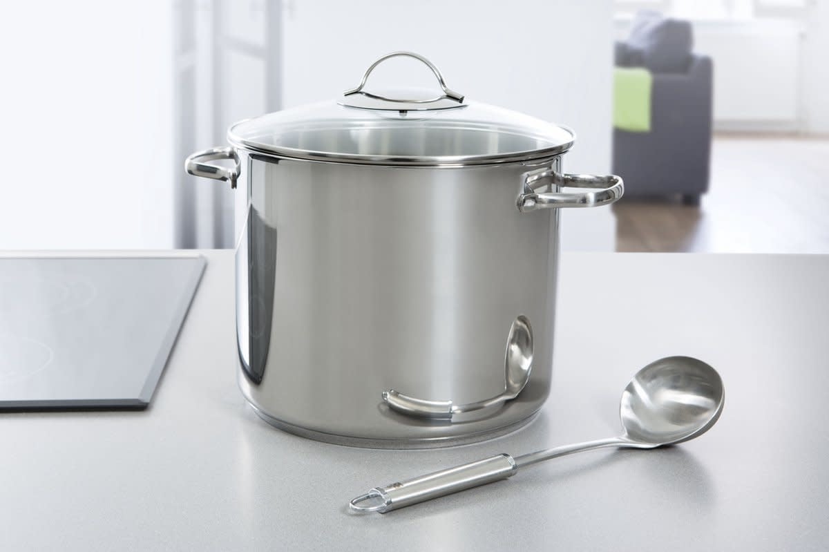 Prepare large batches of soup, stew, or mashed dishes in this 11L BK soup pot. Suitable for all heat sources, including induction, with convenient pouring rim and glass lid.