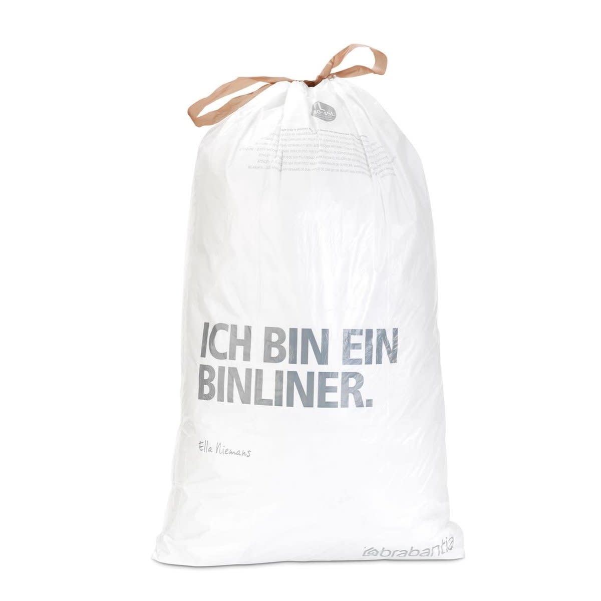 Brabantia's PerfectFit trash bags, fitting various Brabantia bins. Color-coded for sizing, easy application with drawstring closure. Durable HDPE material featuring ventilation holes.