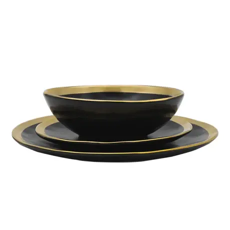 This Golden Onyx 4 Piece Dinner Set is the perfect way to elevate any meal. Its distinctive organic texture and shape, along with the wide gold band, gives this dinnerware set an elegant and sophisticated look—service for 1.