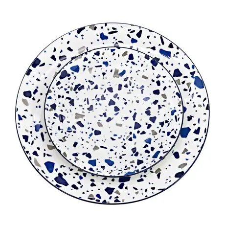 This Pica Porcelain 12 Piece Dinnerware Set is a stylish and durable service for four. The set features a beautiful blue-toned terrazzo design with a bold blue rim, combining modern and classic. Its high-quality construction ensures that it is dishwasher and microwave safe.