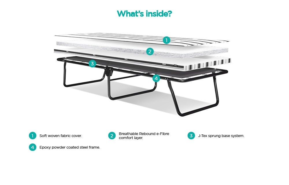 Ideal for camping or travel, this lightweight and compact bed features a breathable Rebound e-Fibre mattress and a durable J-Tex sprung base for comfort and support. It's eco-friendly, hypoallergenic, and backed by a lifetime frame guarantee.