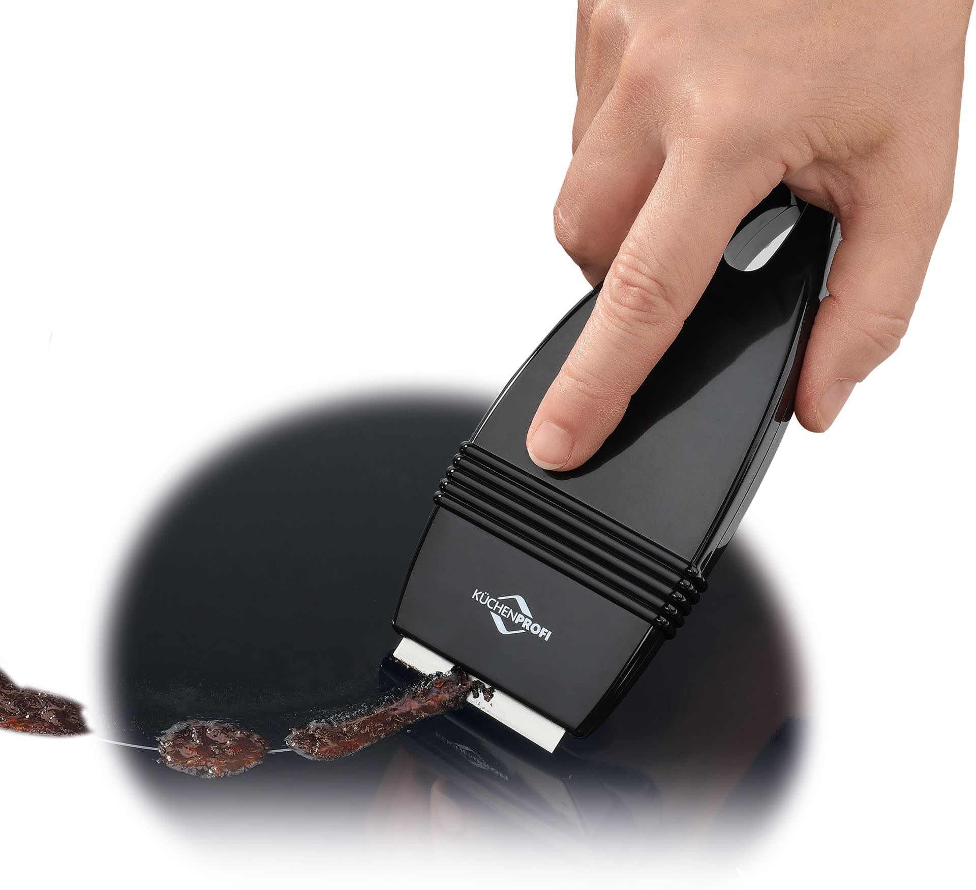 Easily remove burnt residues from glass ceramic hobs with the Küchenprofi scraper. Includes 2 replacement blades and a retractable stainless steel blade for safe use.