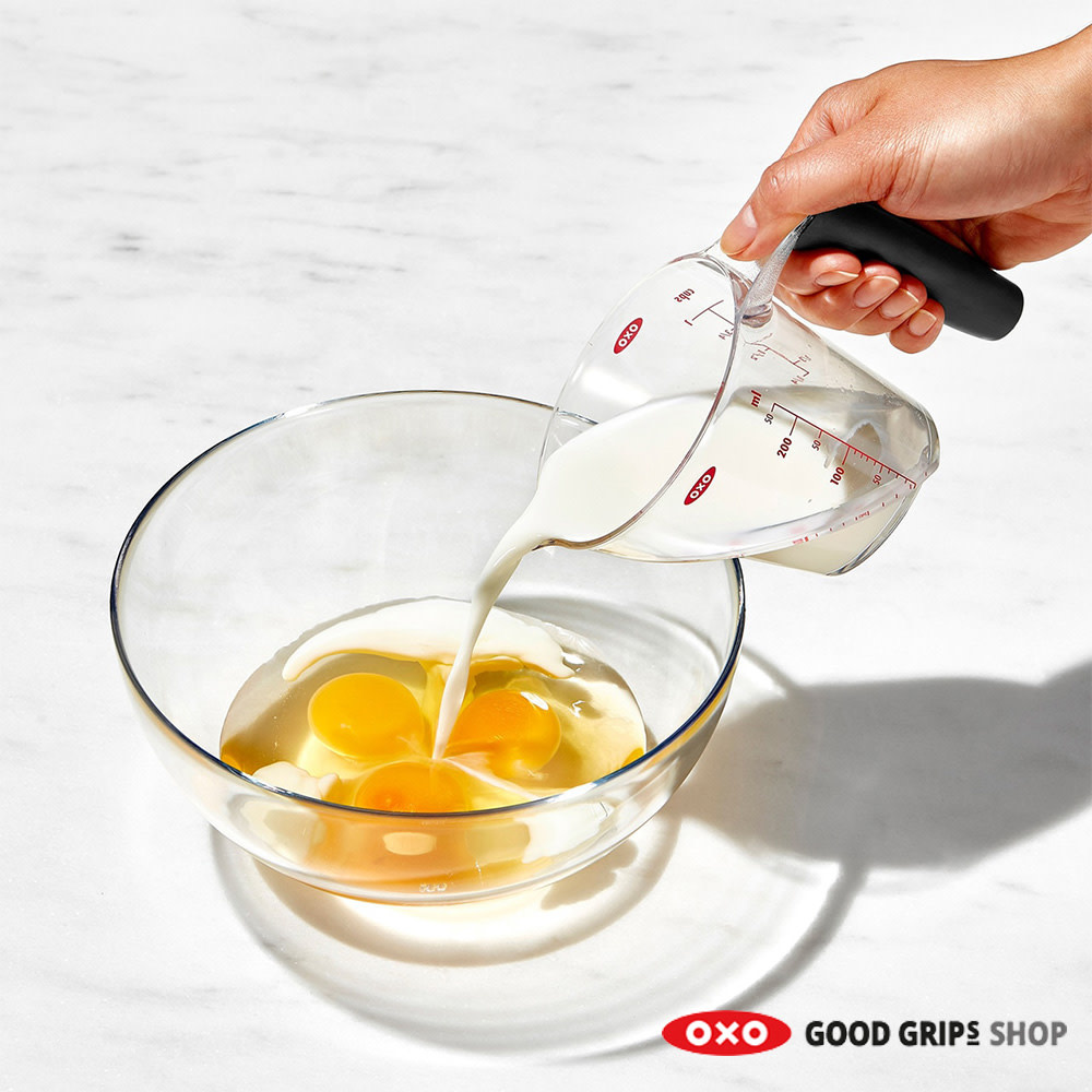 You use the OXO Good Grips measuring jug for measuring liquid and some solid ingredients. Think of milk, water, but also flour, for example. The liter indication on this measuring jug is most common, but the cup indication is also handy, namely when baking cookies and cakes.