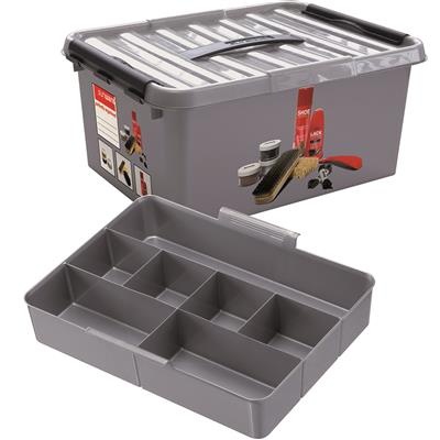 This box is delivered including an instert tray with compartments in which you can for example keep shoelaces, small sponges, buttons etc. In the lower part of the storage box you can keep your shoe polish, aerosols, shoe brushes etc.