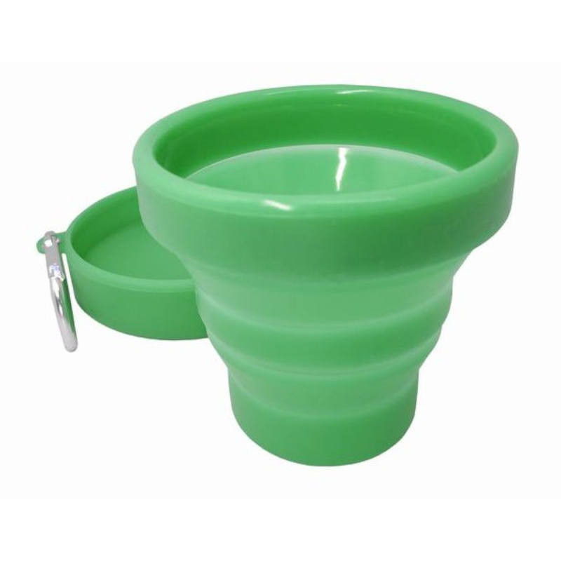 Foldable Silicone Tumbler, with lid and carabiner for convenient transport/storage. Available in two assorted colours: red and green. Flexible, easy to clean and reusable.protect the environment and save money. Pocket size and collapsible; ideal for camping, hiking, picnics and travel. 150ml capacity and comes in a blister pack. Pocket size and foldable; ideal for camping, hiking, picnics and travel.