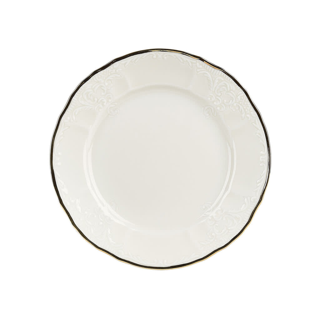 Die elfenbeinfarbene Variante mit Goldrand des Bernadotte-Geschirrs 17cm strahlt klassische Eleganz aus. Dieses von einem historischen Vorbild inspirierte Design zeichnet sich durch ein markantes Design und ein barockes Relief am Rand aus.