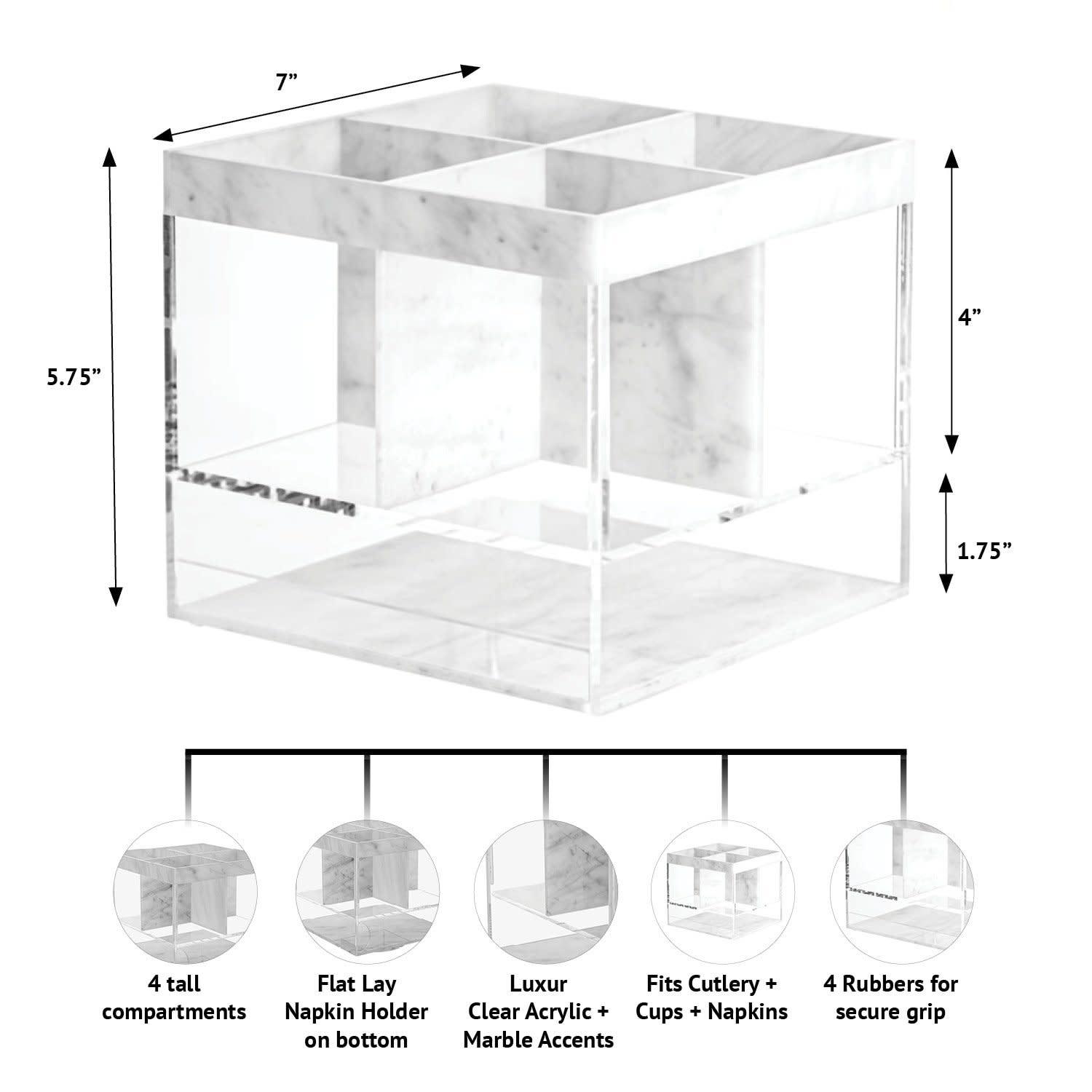 This stunning Lucite Silverware Caddy features marble and clear lucite. It lends the perfect class to your table! Includes four compartments, plus a napkin holder on the bottom. The swivel has a basis on the bottom to rotate freely!